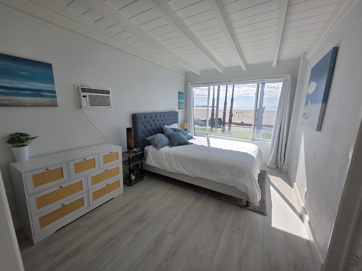 Beautiful house on the beach, lower level. Ocean right outside your door, uncrowded private beach with a historic boardwalk in front of property. Alamitos Bay across the street for swimming and boating, views of Catalina,& downtown LB. Located on Long Beach’s desirable Peninsula, surrounded by 3 bodies of water. Hideaway for locals, and multi million $$ homes. Quiet, safe residential area. Relax under a large covered patio while enjoying ocean sea breezes!
