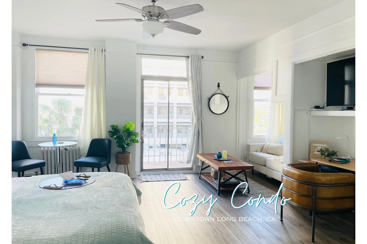 Our cozy condo is located on the 5th floor of the Historic Cooper Arms, a turn of the century building with rich 1920's history. Prime area of Downtown Long Beach with a coffee shop & restaurant in the building. We are nestled between the ocean & the Arts District. Walking distance to the Convention Center, Pine Ave., The Pike, & multiple boutiques, bars & restaurants. Great location for business travelers. AC & 1 FREE PARKING space INCLUDED in offsite structure one block away.