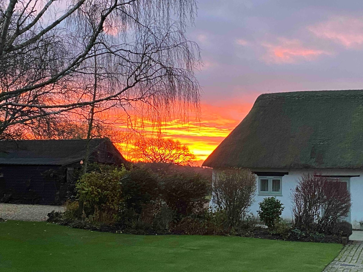 位于宁静的新森林环境中的漂亮的茅草小屋