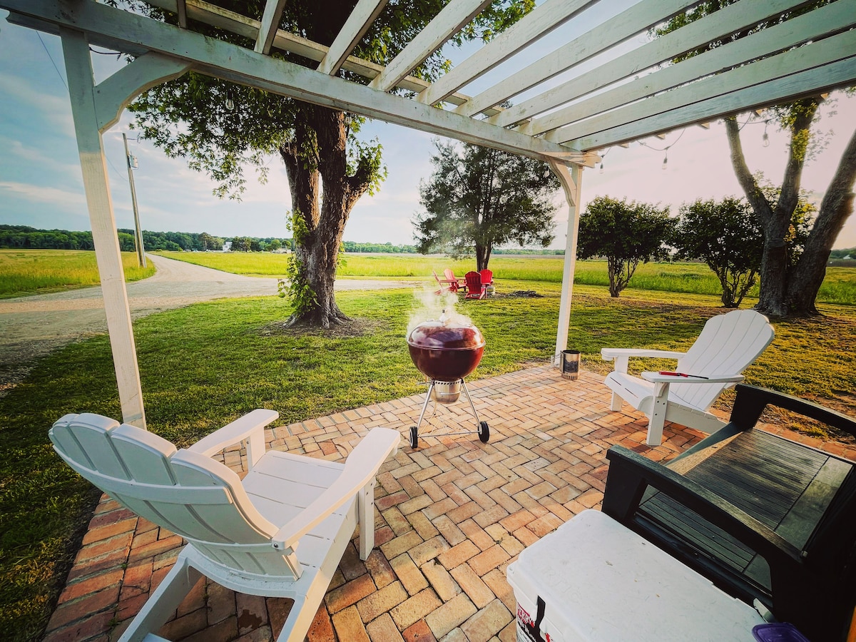 A peaceful, design-forward farmhouse minutes from Cape Charles where vintage fun meets smart-home comfort. Enjoy a private arcade, Peloton gym, EV charger, firepit sunsets, and whole-home Spotify sound. Guests love the vinyl collection, chef’s kitchen, and views of the Magothy Bay Preserve. Relax under wide-open skies by the firepit or start your day on the Magothy Bay trails.