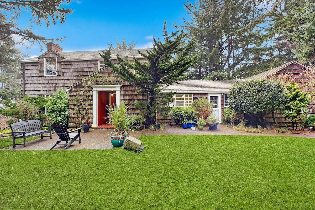 Oceanfront cottage in Depoe Bay with panoramic views above Pirate Cove. This charming one-bedroom, one-bath retreat sleeps up to 4 and blends cozy 1930s character with modern comfort. Fall asleep to the sound of waves and wake with coffee on the deck while watching whales, seals, and bald eagles pass by. Just off HWY 101 and close to Depoe Bay’s harbor, shops, and restaurants. Fully stocked with thoughtful amenities, plus a Tesla charger on site.
