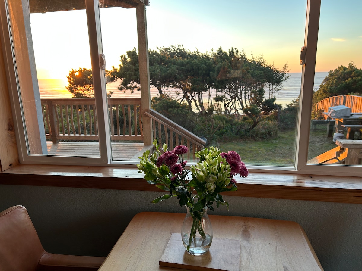 Experience the magic of the Oregon Coast in this freshly renovated oceanfront duplex cottage with gas fireplace, perfectly positioned on pristine Big Stump Beach. Step outside your door onto miles of sandy shoreline, where the rhythmic waves and coastal breeze create the perfect backdrop for your beach getaway. Inside, you'll find a thoughtfully updated interior featuring a fully equipped kitchen with modern amenities, including a dishwasher for effortless cleanup after seaside meals. The cottage accommodates up to four guests with a king bed in the bedroom and a full size sleeper sofa in a cozy TV nook off the living room. The covered oceanfront deck allows you to take in the sounds of the ocean while staying protected from the weather. The gas fireplace adds to the warm and inviting atmosphere throughout your stay. Your Perfect Base for Coastal Adventures: North to Waldport (minutes away): Dive into authentic coastal activities like crabbing from Dock of the Bay or McKinley's Oregon Coast Marina. During low tide, try your hand at clamming near the bridge. South to Yachats (just a few miles): Discover charming restaurants and explore remarkable rocky tidepools along the dramatic coastline. Further Explorations: Visit the fascinating Newport Aquarium (30 minutes north) or embark on an adventure at the Sand Dunes (45 minutes south) - accessible by foot, ATV rental, or guided tour. Traveling with a group? Cape Cod Cottages features eight additional units on the property, perfect for family reunions or friend gatherings. Shared amenities include: 300 feet of private beach access Entertainment-ready game room featuring foosball and ping pong Free guest laundry facilities Three EV charging stations