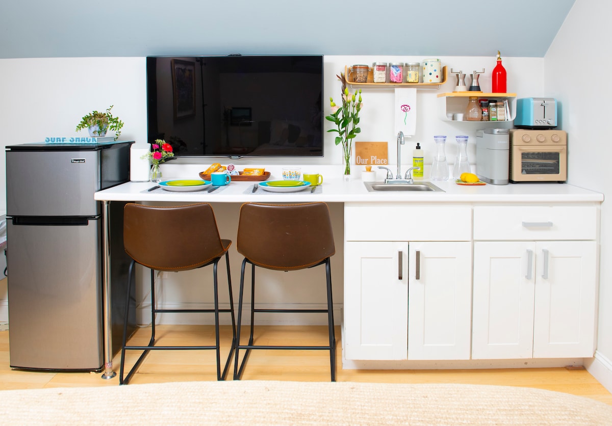 Attached to a family home but its own private space—including a private entrance, dedicated parking space, small deck, and lawn area with seating—this sunny studio is in the walkable heart of Wakefield, near URI, beaches, Newport, bike path. Queen bed; queen sleeper couch; best suited to 2 adults (the sleeper couch works best for children). Fridge, micro, coffee, grill (no oven). Allergy friendly: Free & Clear laundry products; no pets. Self check-in. Automatic discount for longer stays.