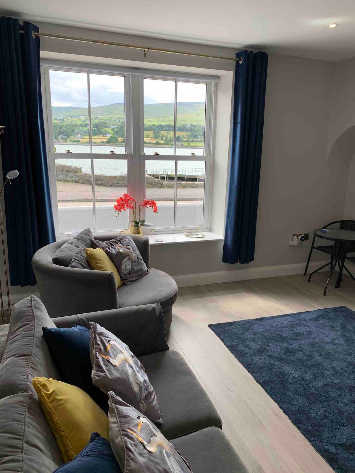 Newly refurbished top floor apt located on the tranquil shoreline in the centre of Warrenpoint, less than 5 min walk from the beach and numerous cafés, bars, restaurants, shops and the Whistledown Hotel. Perfect for couples on short visits. Includes a fold out bed for 2 extra guests. Bright space that gets all of the afternoon and evening sun, with views of the beach, docks and mountains. Close access to Carlingford Lough, Kilbroney, Rostrevor, Silent Valley and the Mournes.