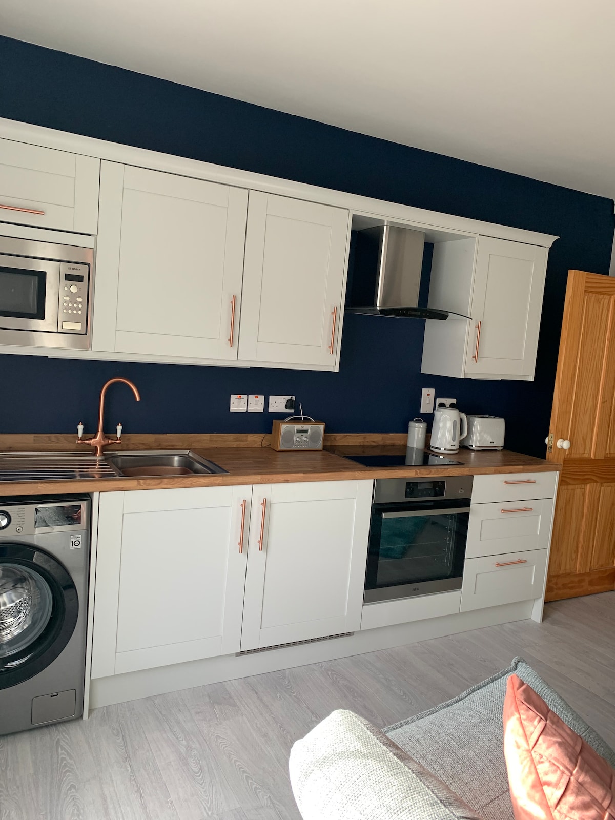 With it's own private entrance for your safety "The Beeches" is located in a sought after residential area in its own grounds. We offer a private suite consisting of a bedroom with king size bed, a sitting room, a fully equipped kitchen, separate utility area with washing machine and dryer and a toilet/ shower room all of which are exclusive to the guest. Work desk and chair and high speed fibre broadband provided.