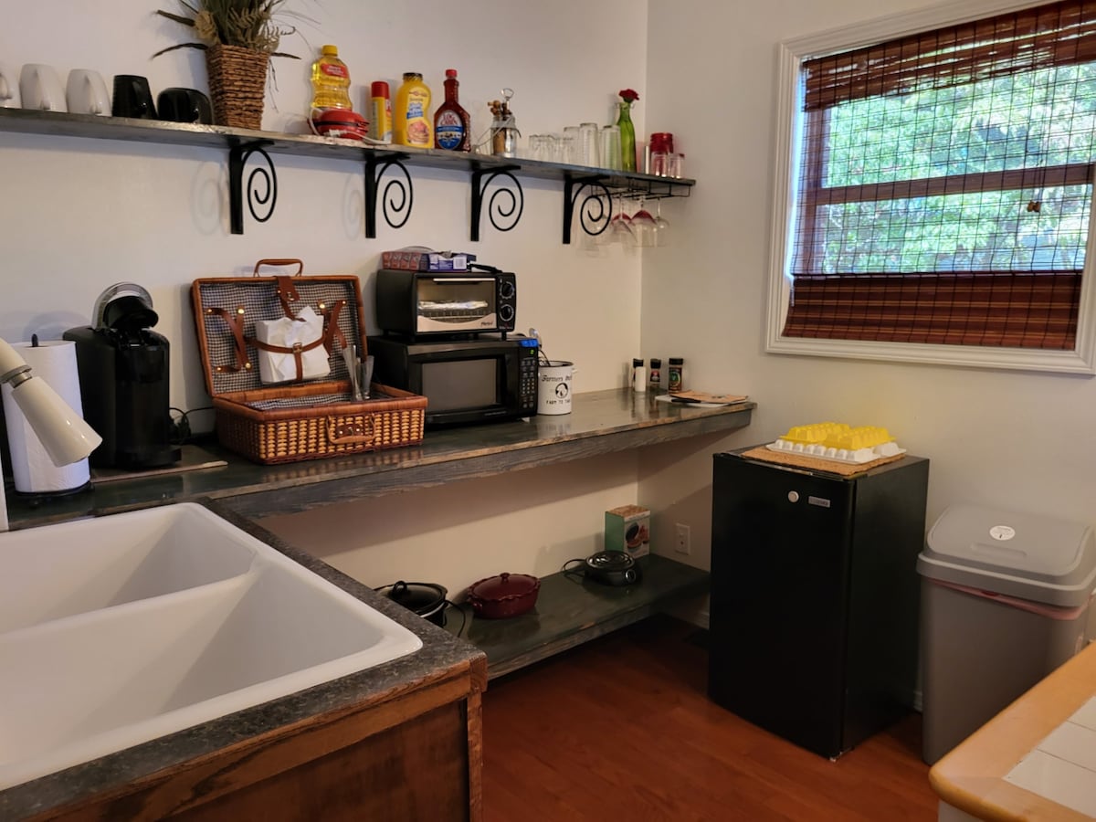 Tucked away in a small neighborhood at the end of a private road, this upscale second-story studio suite accommodates up to two guests. Midcentury inspiration meets modern comforts with two outdoor living spaces, well-equipped kitchen, Nectar hybrid mattress w/ luxurious bedding, spacious shower w/ Bluetooth speaker, 65" TV w/ Klipsch speakers, classic gaming consoles, 300 Mbps WiFi, and washer/dryer. Just a few minutes from downtown. Enjoy a restful and convenient stay at this secluded retreat.