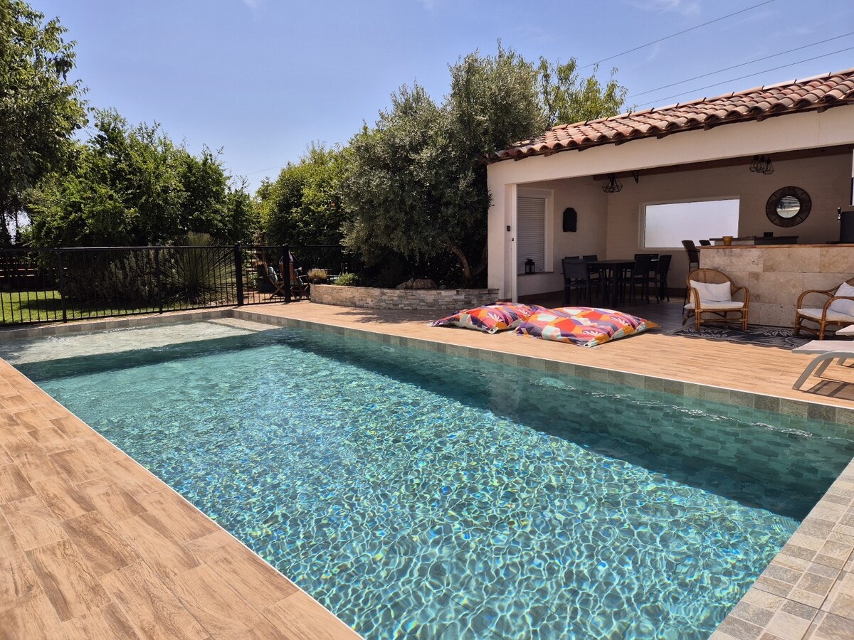 Pour vos vacances idylliques, dans notre villa contemporaine neuve de 115 m2 en plain pied,bordée d'un jardin de 400 m2 arboré, avec piscine.Pour un séjour idéale en famille ou entre amis.Vous serez accueillis par 1 entrée,wc séparé, séjour spacieux et lumineux,cuisine US conviviale,équipée,3 belles chambres lit en 160x190 et dressing, 1 chambre cabine avec lit superposé pour les enfants, salle d'eau avec douche italienne et double vasque,1salle de bain avec douche italienne,1 baignoire et wc.