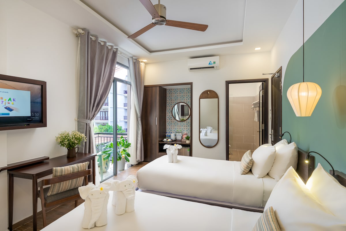 Volar Balcony Deluxe Double. Having a balcony with great view of the town Very quiet, comfortable & well-appointed, accommodate up to 2 people. . 10' walking to the riverside, boat tour and lantern festival monthly . 7' walking to the night market and street foods with bar and restaurant . Room is fully furnished with air-condition, ceiling fan, private bathroom, mini bar, working desk... . Enjoy the pool from 7.30 am to 9.30 pm . Information center/travel consultants: from 7.am to 10pm