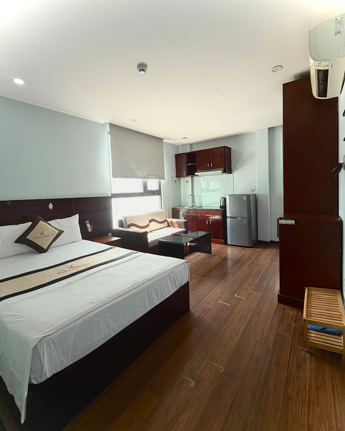 Deluxe 2 bed studio apartment, sleeps 3 adults (2 kids under 6yrs are free), with kitchenette, Smart TV (Local TV plus Netflix/You Tube/Internet), sofa, dining table & 4 chairs, tall fridge, bathroom (shower). All rooms have great views that have a view of the East Vietnam Sea, while some also have views of the Marble Mountains, of the local golf course, Co Co River. All rooms have a panoramic view, that are unhindered by next door buildings.