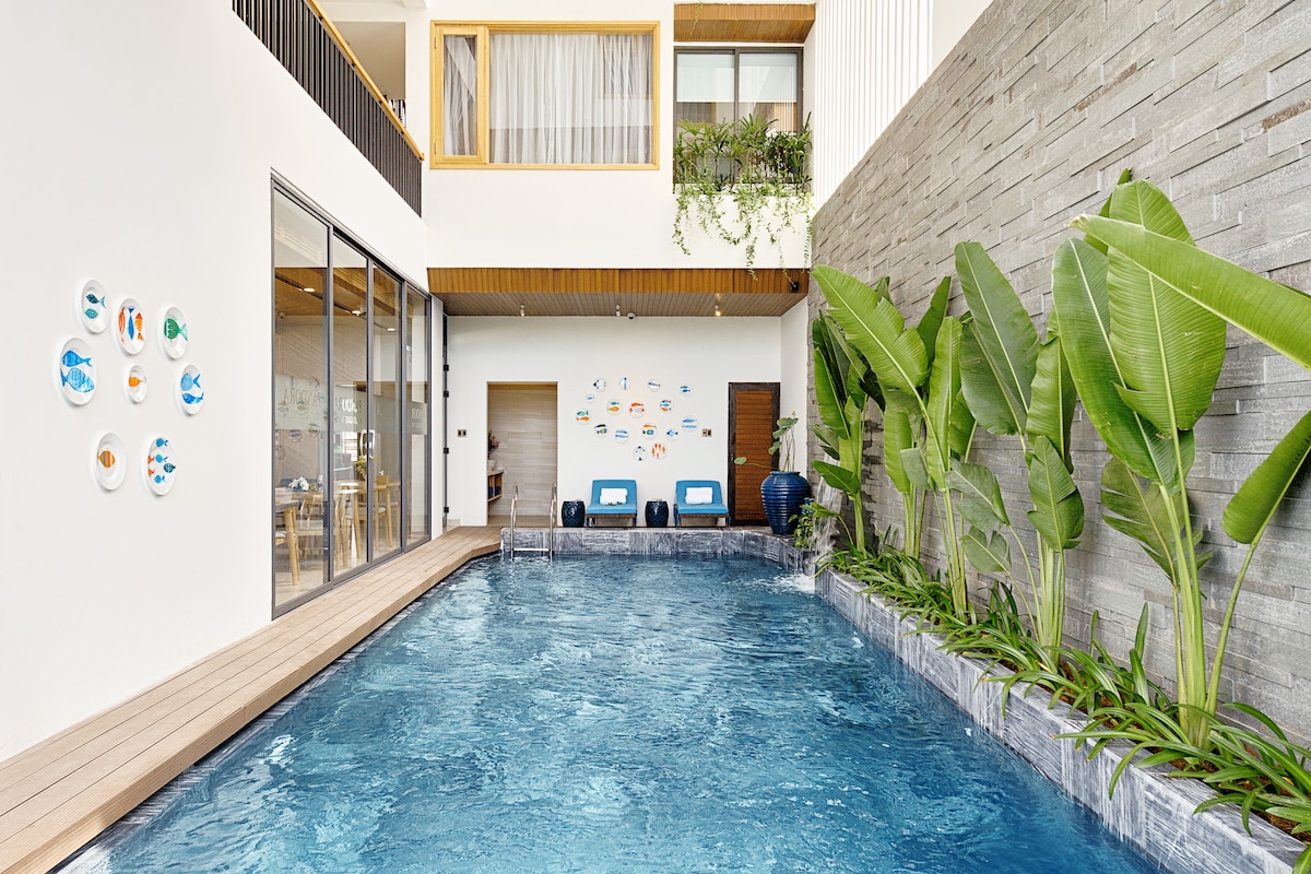Deluxe rooms on the 2nd and 3rd floor, have a private balcony with view look down to the salty pool. The room has a King-size bed 2m x1m8, a private bathroom, and a small kitchen, which are 40 meters square large. It's suitable for 2 adults and 1 kid (under 6). The room rate DOES NOT include the breakfast fee. We also have free bicycles and laundry services. Free Floating afternoon tea