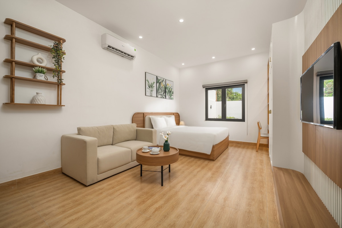 Experience Da Nang from above in this bright and elegant 4th floor studio. Enjoy wide city views from your private balcony and plenty of natural light from large windows. The space feels open and peaceful, blending minimalist design with cozy comfort. A spacious workstation with a comfortable chair sits by the window, giving you a calm and inspiring place to read, work, or simply enjoy the breeze. Perfect for travelers seeking calm, modern living close to the city’s energy.