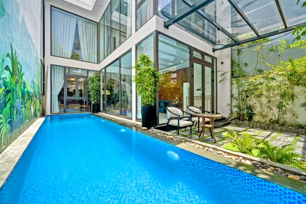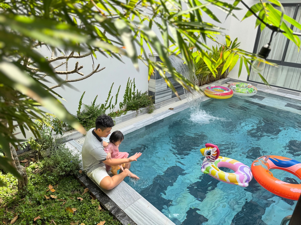 This is the Danang Blue Points Pool Villa. The villa is entirely private (free pick-up service). This pool villa is perfect for a vacation with friends or family. The villa is located on An Thuong Foreign Street, surrounded by cafes, spas, restaurants, supermarkets, and bars. My Khe Beach is a 5-minute walk away. The airport is a 10-15 minute drive. The swimming pool measures 3.2m x 8m (1.4m deep). Purified water is available in the kitchen.