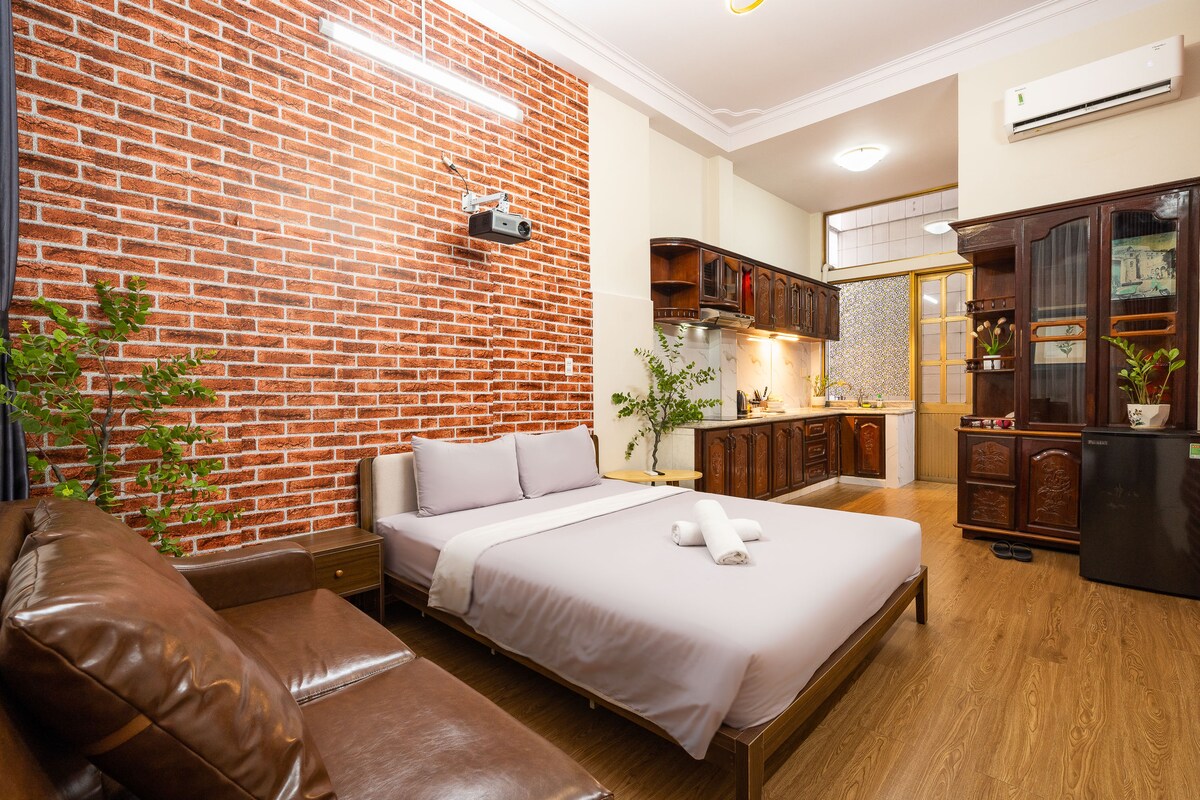 Our bright and spacious space is located in District 1, the heart of HCMC. - Elevator is available - LOVELY STUDIO with FULLY-EQUIPPED KITCHEN and WINDOW - PRIVATE bathroom - Towels are included and changed everyday for free. - FREE wifi, cleaning everyday.