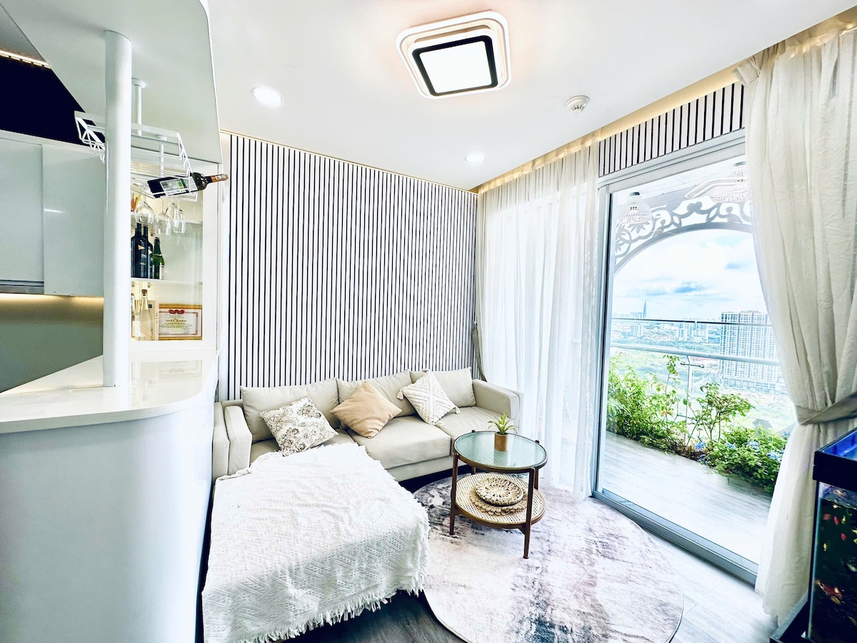 A stylish & comfortable apartment 85m2 at Hung Phuc Happy Residence Premier located in the heart of district 7, Phu My Hung, with just a short walk to all the best shops, restaurants, and conveniences. Nearest bus stop in front. Highly educated and quite neighbors that surrounded by green parks and beautiful villas. Decorated in modern Japandi x Wabi sabi style with a focus on natural materials & clean lines. A great getaway or even staycation for those who want to experience new things.