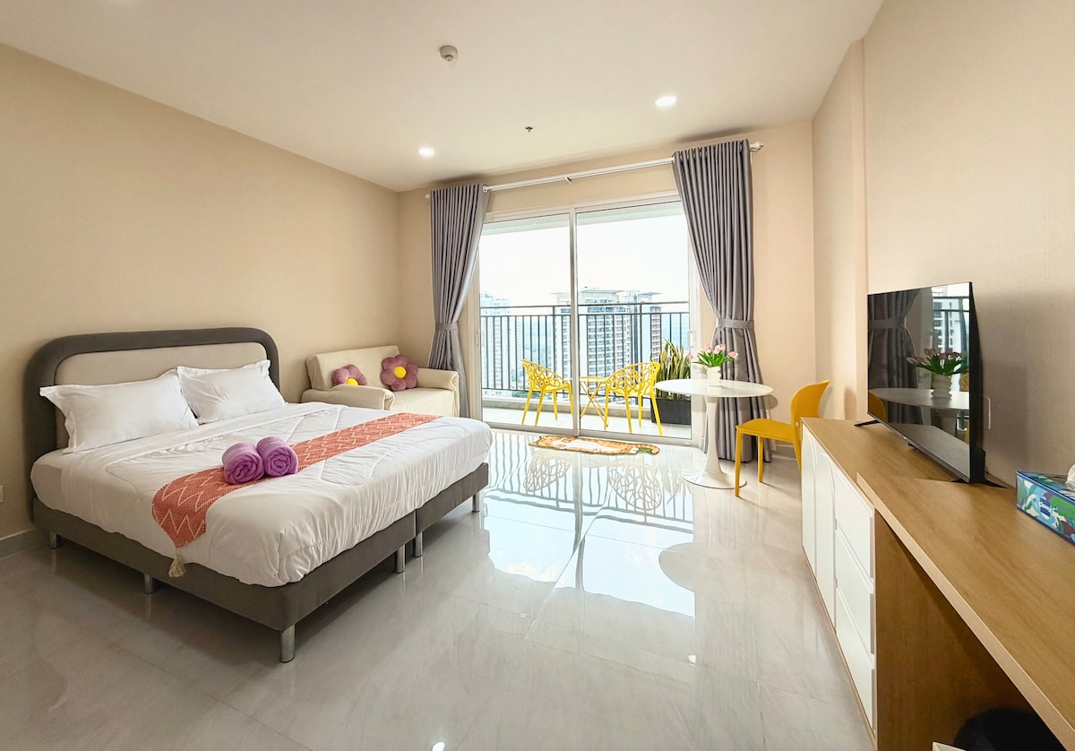 Căn hộ studio với ban công rộng lớn view thành phố nằm trong tòa nhà Sunrise Riverside ở phía Nam Sài Gòn. Dưới căn hộ có Starbuck Coffee Chỉ mất vài phút để đến trung tâm thương mại (Vivo City) và Trung tâm triển lãm (SECC). Bên cạnh đó, còn có rất nhiều cửa hàng tiện lợi và các nhà hàng (7-Elevent, Family-mart, K-Mart, BBQ, Hotpot..) Có dịch vụ dọn phòng miễn phí cho các đặt phòng trên 3 đêm. Nếu cần, bạn có thể thông báo trước 1 ngày.