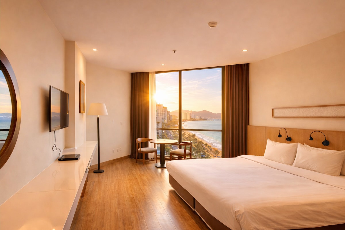 • Perfect choice to fully enjoy Nha Trang’s ocean view • Located in the absolute city center, steps from the beach • Unique fan-shaped apartment with a rare, wide curved balcony • Panoramic sea view overlooking the iconic coastal road arc • One of the widest and most open ocean views in Nha Trang • Hotel-style king bed, cozy sofa, and relaxing bathtub • Walk to laundry services, great restaurants, cafés, and night market • 24/7 check-in with professional front desk support
