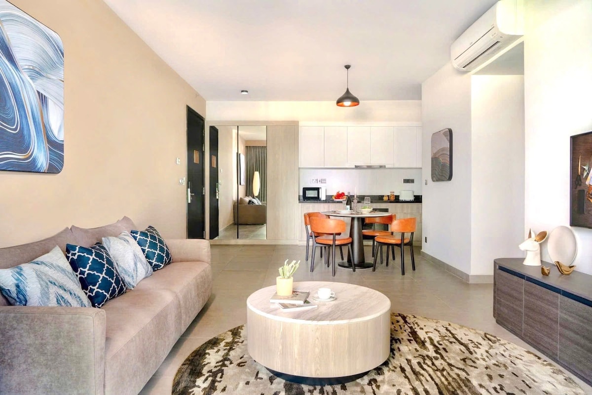 Please be advised that there is ongoing construction in the surrounding area. While the work does not affect access or the quality of the apartment, some daytime noise may be audible. You will feel relaxed in this calm and stylish space. There are many convenience stores, restaurants, and coffee shops nearby, along with access to infinity pool and gym. 15 mins to reach Thao Dien This 1-BR condo has beautiful city view 1 bedroom 1 bathroom Kitchen and living room Smart TV with Netflix function