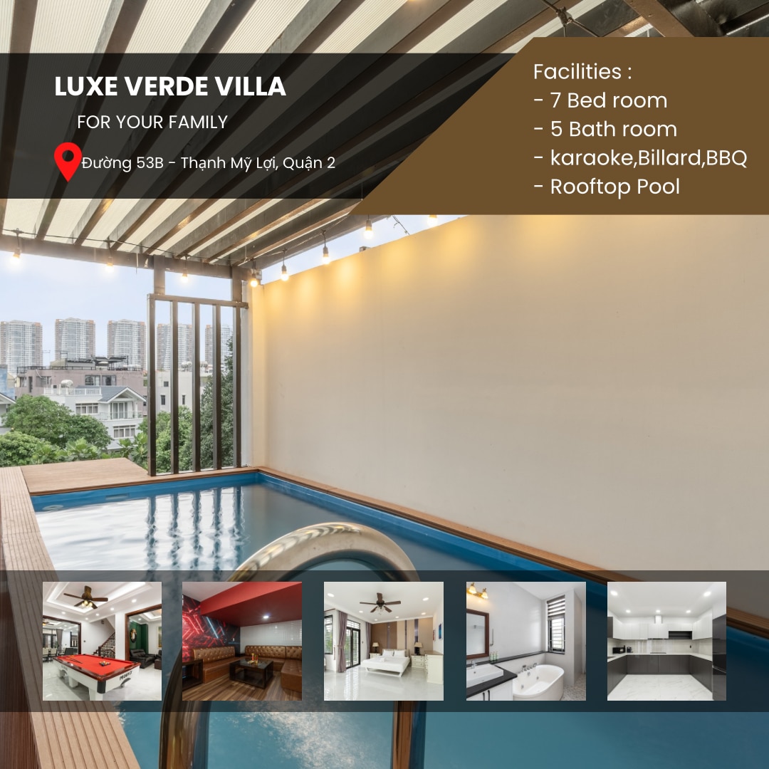 Villa kiến trúc cổ điển – 7PN gần trung tâm Quận 1 Trải nghiệm không gian nghỉ dưỡng đẳng cấp tại villa thiết kế sang trọng với phong cách cổ điển tinh tế. 7 phòng ngủ – 8 giường – 5 phòng tắm, phù hợp cho nhóm bạn, gia đình lớn hoặc team building. Phòng khách rộng với sofa da cao cấp, bàn billiards, kết nối trực tiếp với khu vực ăn uống – lý tưởng để tiệc tùng. Phòng karaoke riêng & hồ bơi thư giãn trên tầng thượng Vị trí đắc địa – chỉ 7 phút di chuyển đến trung tâm Quận 1