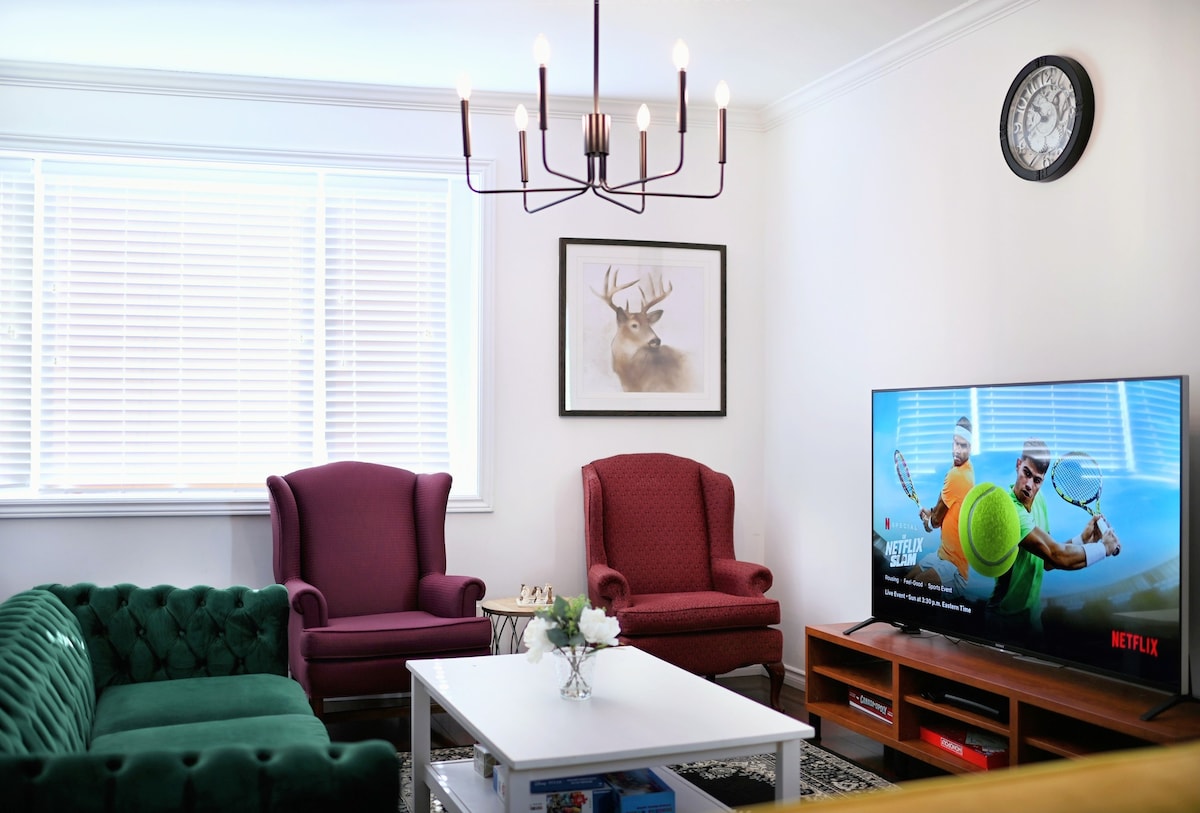 Cozy one bedroom apartment in a quiet neighborhood, about a 5 to 10 minute drive or 30 minute walk from Niagara Falls and Clifton Hill. Relax in the living room with 55 inch smart TV and Netflix, enjoy 1.5 Gbps fiber Wi Fi, and cook homemade meals in the basic functional kitchen. Comfy king bed, fresh linens, self check in with smart lock, pet friendly and free onsite parking make it a calm, practical base for couples, friends and work trips who prefer a clean home feel over a busy hotel.