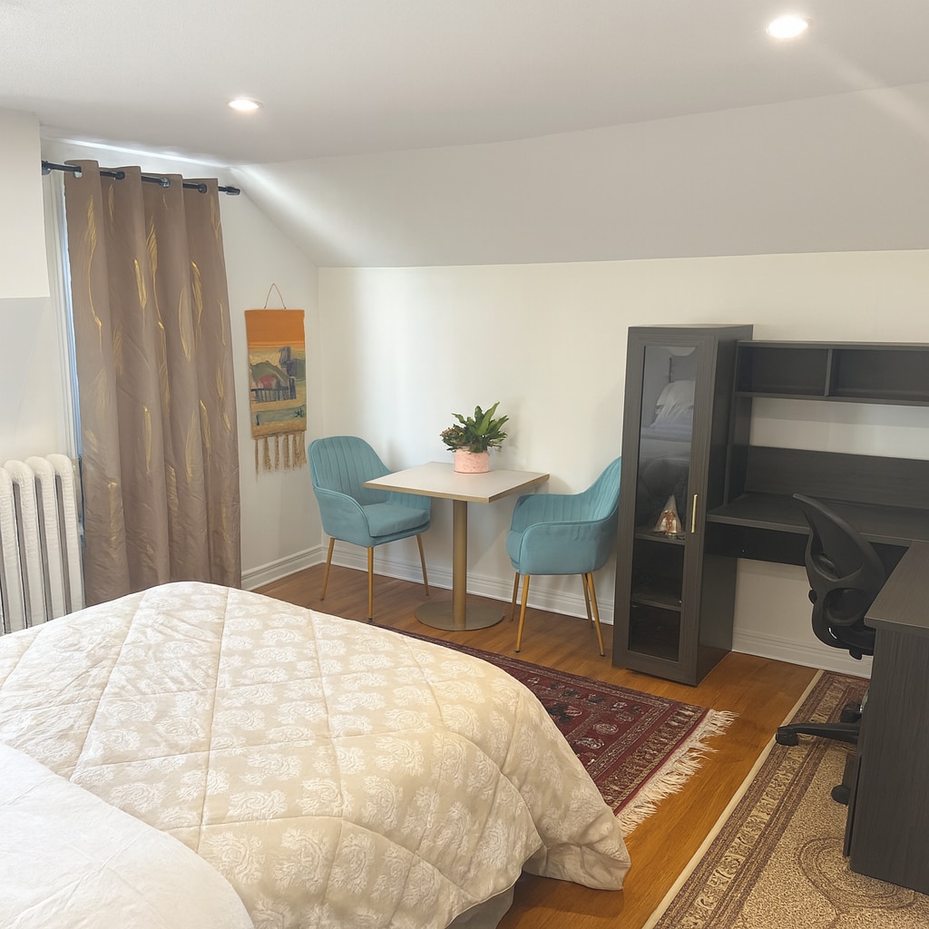 This home boasts a beautiful bedroom, and a living room, with access to a big screen TV, Netflix, laundry, and a bright bathroom with a window in the shower. located on the top floor of a duplex. Newly renovated. A/C. New furnishings and attention to detail have been added to ensure a wonderful stay. Unlimited wifi!! Great location and neighbors, about a 10-minute walk to the falls 7- minutes to Clifton hill and a 3-minute drive.