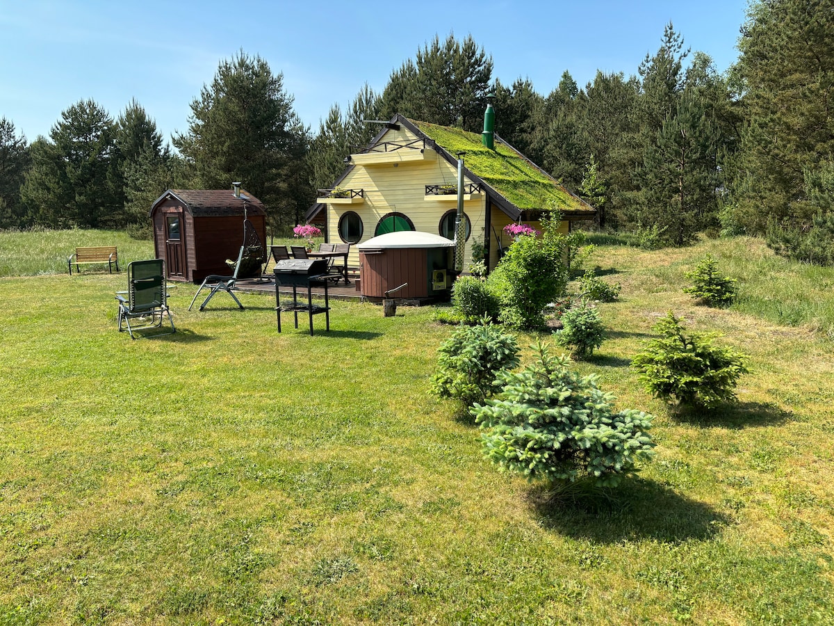 Exclusive house 150m from the sea ☀️ with green roof and cozy upstairs loft inspired by hobbit homes. Only 6km from Liepāja. The property is bordering the Baltic sea. Enjoy your holidays by the sea in a clean white sand beach. Sauna included. Outdoor bathtub for additional price.