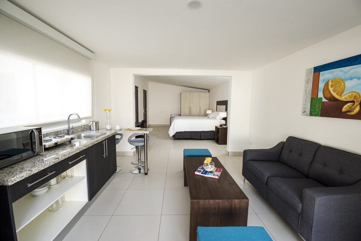 Luminosa habitación, confortable y equipada con todo lo necesario para una estancia inolvidable; cama full, nevera, cocina equipada, abanico de techo, baño privado. Esta ubicada frente a la piscina, cuenta con una terraza, una hamaca y 2 sillas perezosas con su mesita.
