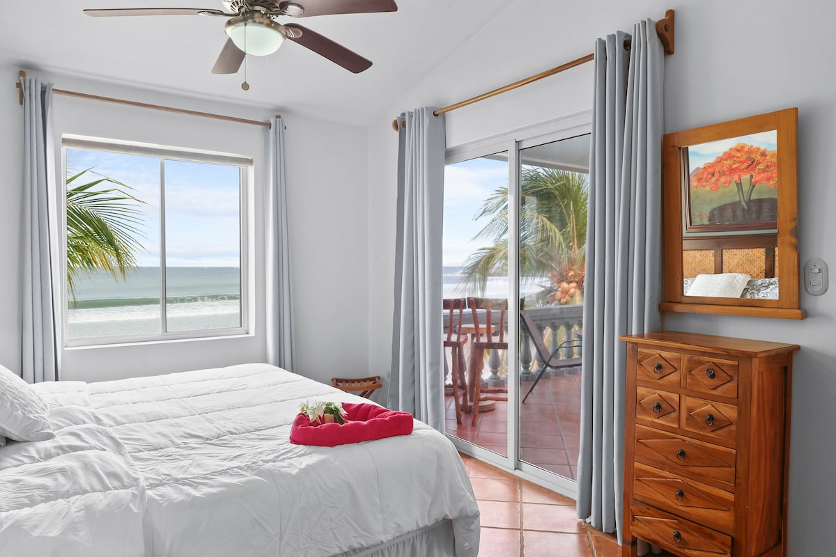 BEACH FRONT 2nd story large villa with terrace. 3BD/2BA. Sleeps 7 comfortably. The Master bedroom has a new king size bed with a private bathroom. The second room has two twins and the third room offers a queen bed and another twin making ample space all. Kitchen is fully stocked. The villas have a swimming pool and outside living area. Hacienda Iguana is a private GOLF gated community. Catering is available - different food options - we do ALL grocery shopping, cooking and cleaning!