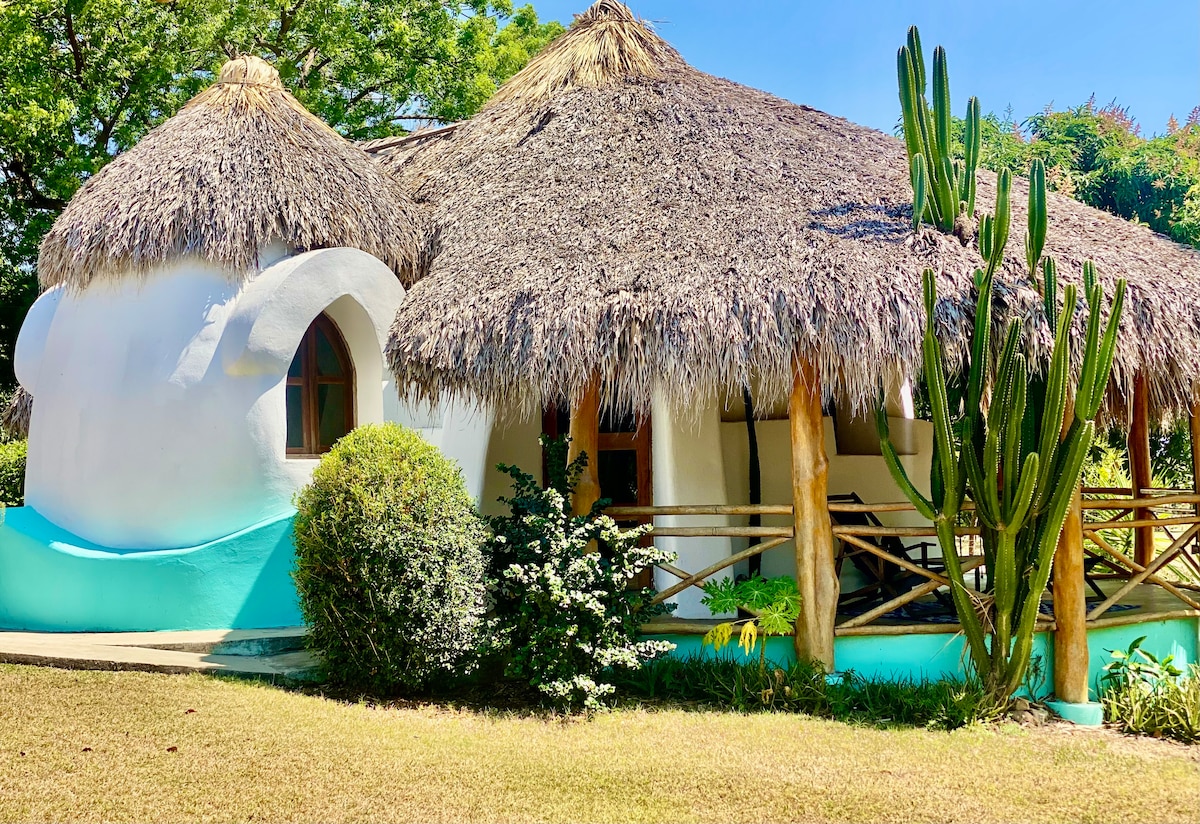 Your Eco-friendly home away. Immerse yourself in a real ecológica newly built 2 le el Villa. Natural breeze and light, private terrace silent and safe..nature with all the comfort, The Villa seat on a lush guarden only 150 mt from the beach, wi fi, kitchen living room and a beautiful and large bathroom with a unique architecture design including round walls and arched windows. Walls made from natural resources as soil, the roof are covered with the traditional Nicaraguan "Rancho style".