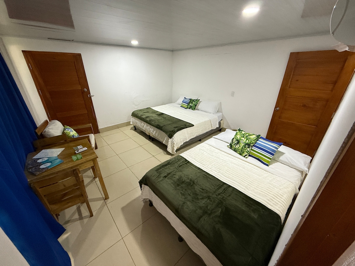 Brio room is a vibrant and comfortable room with a double bed and a private bathroom. This room is excellent for a couple or single. It comes with a ceiling fan and a portable fan. Fan only room. Enjoy your own private terrace, as well as a community terrace nestled between the trees. There is a shared kitchenette to prepare your meals. The large swimming pool area offers a tranquil space to bathe, relax and enjoy incredible views of the sunset over the ocean.