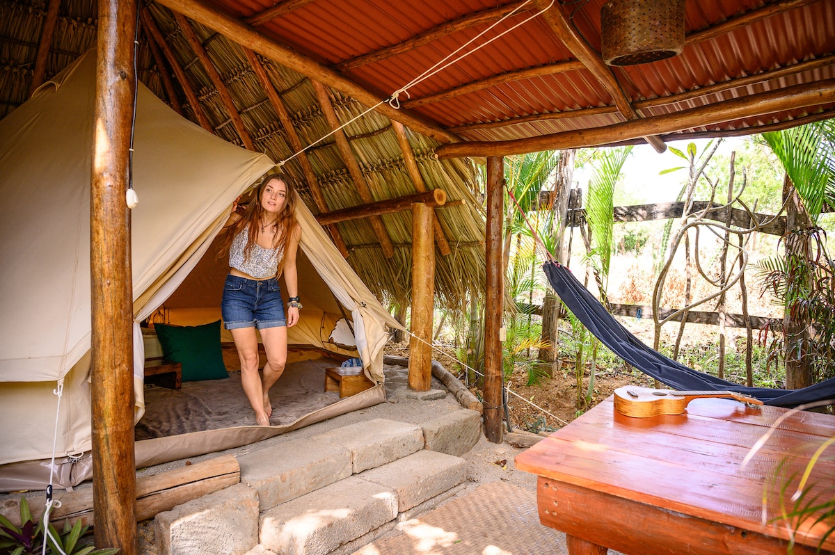 Cozy glamping tent surrounded by nature, fully equipped with mosquito nets all around and a queen bed for a comfortable stay. There is light and power in the tent. Enjoy a private seating area with hammock and chairs under a natural roof.