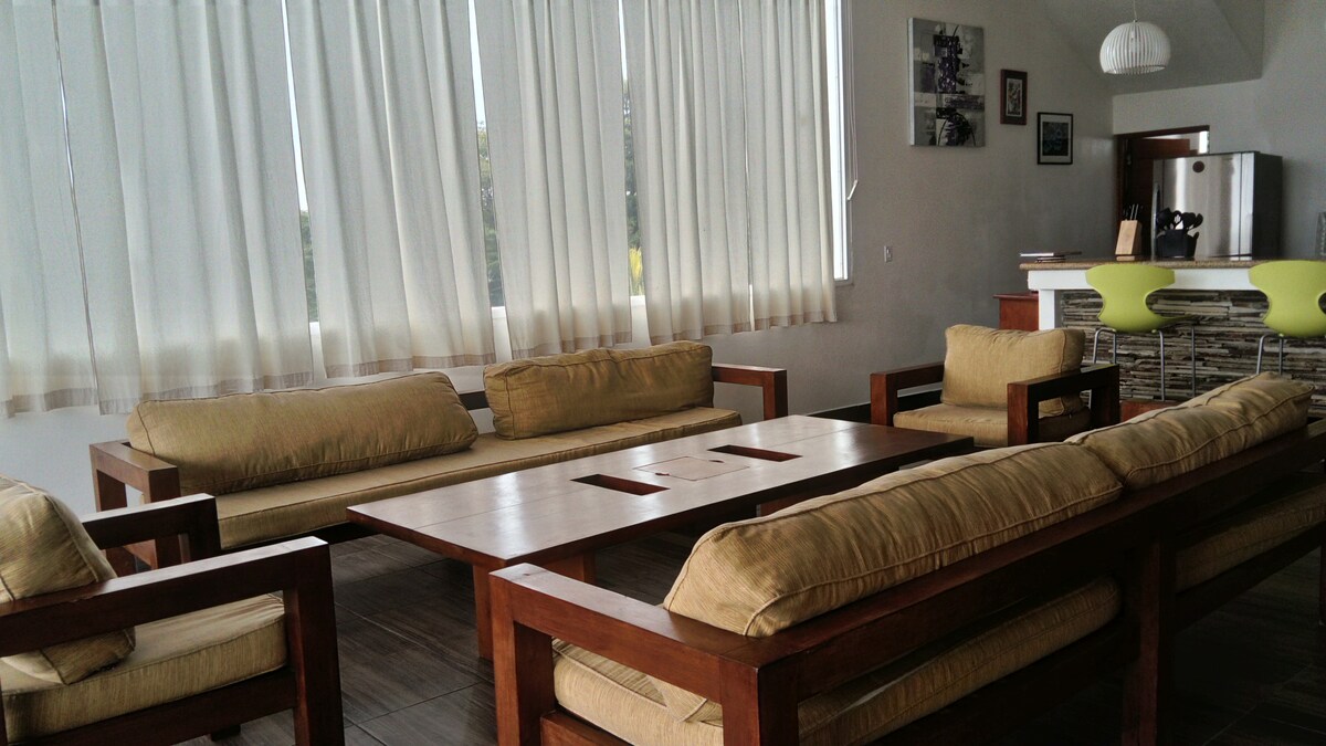 Enjoy a stylish experience at this centrally-located place! This recently renovated house is located in a safe gated residential area, it takes a seven minutes drive to get to Galerias Santo Domingo mall, restaurants, supermarkets, pharmacies and much more. It offers a private and quiet accommodation for vacationers and business travelers. The unit features a comfortable king sized bed, 1 queen and 1 full sized bed. TV and AC, hot water, washer and dryer, work space and a delightful kitchen.