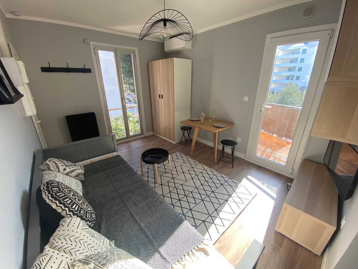 Magnifique vue mer, calme et sérénité pour ce duplex cosy, entièrement climatisé, tout près du port, de la plage et du centre ville, dans une maison individuelle. Relaxez vous dans un bain de soleil, à l'ombre de la banne, et goûtez à la Dolce Vita. Désinfection des surfaces et poignées. Aucun contact avec d'autres résidents. Parking gratuit sur place au sein d'une voie privée. Agréable jardin/terrasse ensoleillé. Plage et restaurants à 3 min à pied. Port, tramway et commerces à 7 min à pied.