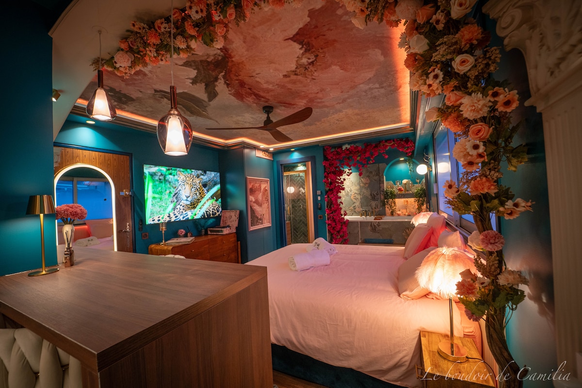 Bienvenue dans La Suite des Aventuriers, votre camp de base unique en plein cœur de Nice. Vivez l'expérience d'un décor de cinéma inspiré des grandes explorations d'Indiana Jones. Jungle luxuriante, home-cinéma XXL, douche sculptée dans la roche… chaque détail vous plonge dans une aventure tropicale à deux pas de la coulée verte au coeur de Nice. À 5 minutes du tram, des restaurants et des commerces, cette suite pour 2 à 4 voyageurs offre une escapade dépaysante, ludique et unique à Nice.