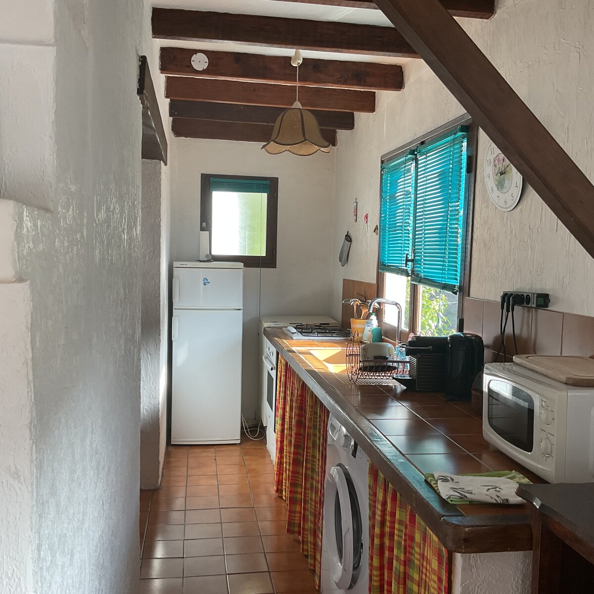 Cuisine ouverte sur coin repas comprenant : micro-onde, lave linge, congélateur bac, frigidaire, machine à café nespresso, bouilloire, grille pain, plaque de cuisson. Patio: 1 table et 4 fauteuils de jardin, barbecue. 2 bains de soleil dans le jardin privatif. Salon : un canapé deux places, deux fauteuils assortis, meuble bar, télévision. Couchages 1 canapé 140 Chambre : 1 lit de 140, terrasse avec table et 2 fauteuils + jardin privatif. Petit animal accepté sur demande. Lit bébé, chaise haute.