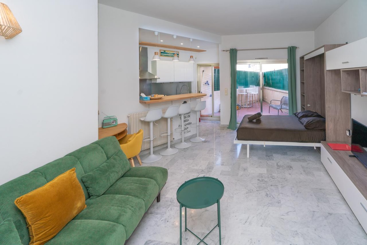 Newly renovated studio with a private sunny terrace located in the Antiques district close to the Port of Nice. The 24 m2 studio (+ 7 m2 terrace) has a light, airy open-plan living space including a fully equipped kitchen-diner, lounge/bed room with a top quality Italian fold-down sofa bed. Separate bathroom with spacious shower, WC and washing machine. It is on the 1st floor (US: 2nd floor) with an elevator. The new tram line - just 300m away - is a real advantage (see Getting Around below).