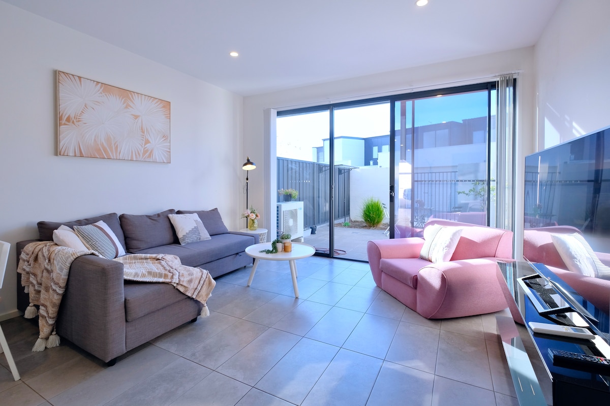 Relax with the whole family at this peaceful place to stay. Property highlights: - Free Wifi - Large deck outdoor - 2 Queen size beds - 2 Bathrooms and 2 bathrooms upstairs - 1 garage parking 1 driveway parking Location: - 2 minutes drive to University of Canberra - 6 minutes drive to Westfield - 15 minutes drive to Canberra City Pls note that the next door is also available for AirBnb. You can book the 2 townhouses together for your large family, but with some added privacy.