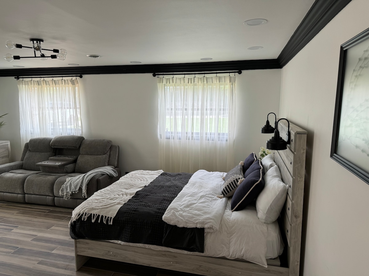 Reconnect with friends and family in our newly remodeled guesthouse. The main living space is open and light filled. A great place to enjoy a family game night. The bedrooms are just the right size to enjoy a restful nights sleep. Need to do laundry- no problem this guest house has it’s own laundry room with stackable washer and dryer. Roast s’mores by the backyard fire pit and enjoy watching the lightening bugs from the deck.