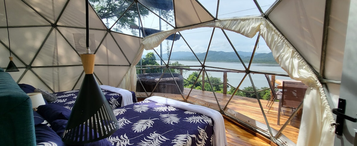 Glamping Dome surrounded by nature & wildlife with panoramic mountain & ocean views. ● The areas: ☆ Parking ☆ Hammocks area ☆ Tiny pool under the trees. ☆ 1st floor terrace with kitchen, bathroom & dome ☆ 2nd floor terrace with panoramic views ● Descripción: A fully equipped kitchen with an outdoor barbecue, bathroom with rain shower & hot water, air-conditioned room, tiny pool under the trees, area with hammocks to relax, terrace with panoramic view, WIFI, private parking & security cameras.