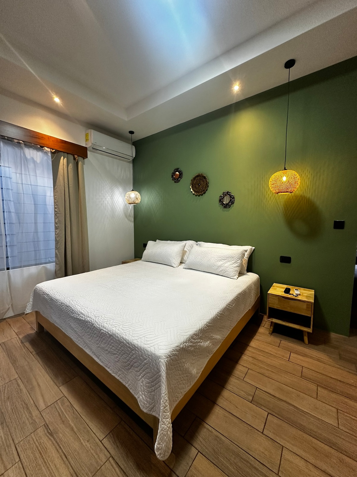 A spacious land nestled among fruit trees, Ceibos, and Guanacastes, our artistic abode invites you to unwind in a tranquil atmosphere. Adorned with handcrafted touches, this sanctuary blends rustic elegance and modern comfort. with one master bedroom and one kids room, This home is ideal for a family with young kids as it is walking distance to Wild Child Play Garden, 10 min. drive to Guiones beach, 7 min. to Pelada, and 10 min. to Ostional, a world renowned sea turtle breeding sanctuary.