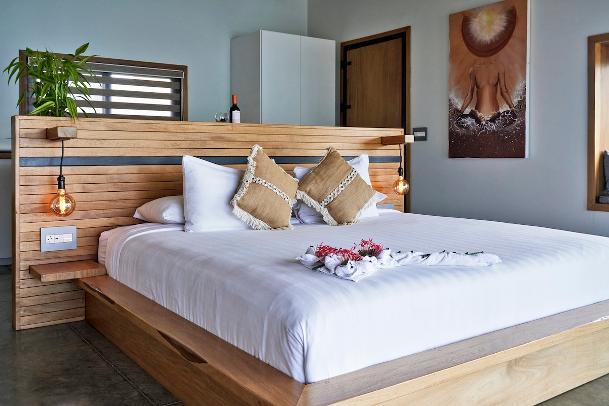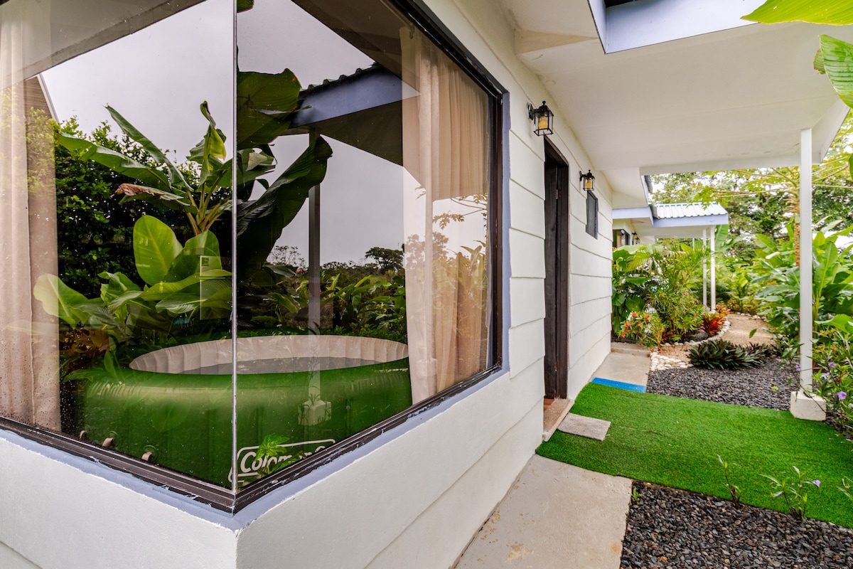 This superb villa was design ideally for couples that want 100% privacy and maximum confort, while enjoying the majestic view of the garden and pool. This villa includes king size bed, fully equipped kitchen, Ac, private bathroom, and a large deck with a big sofa ideal to relax after a good surf.