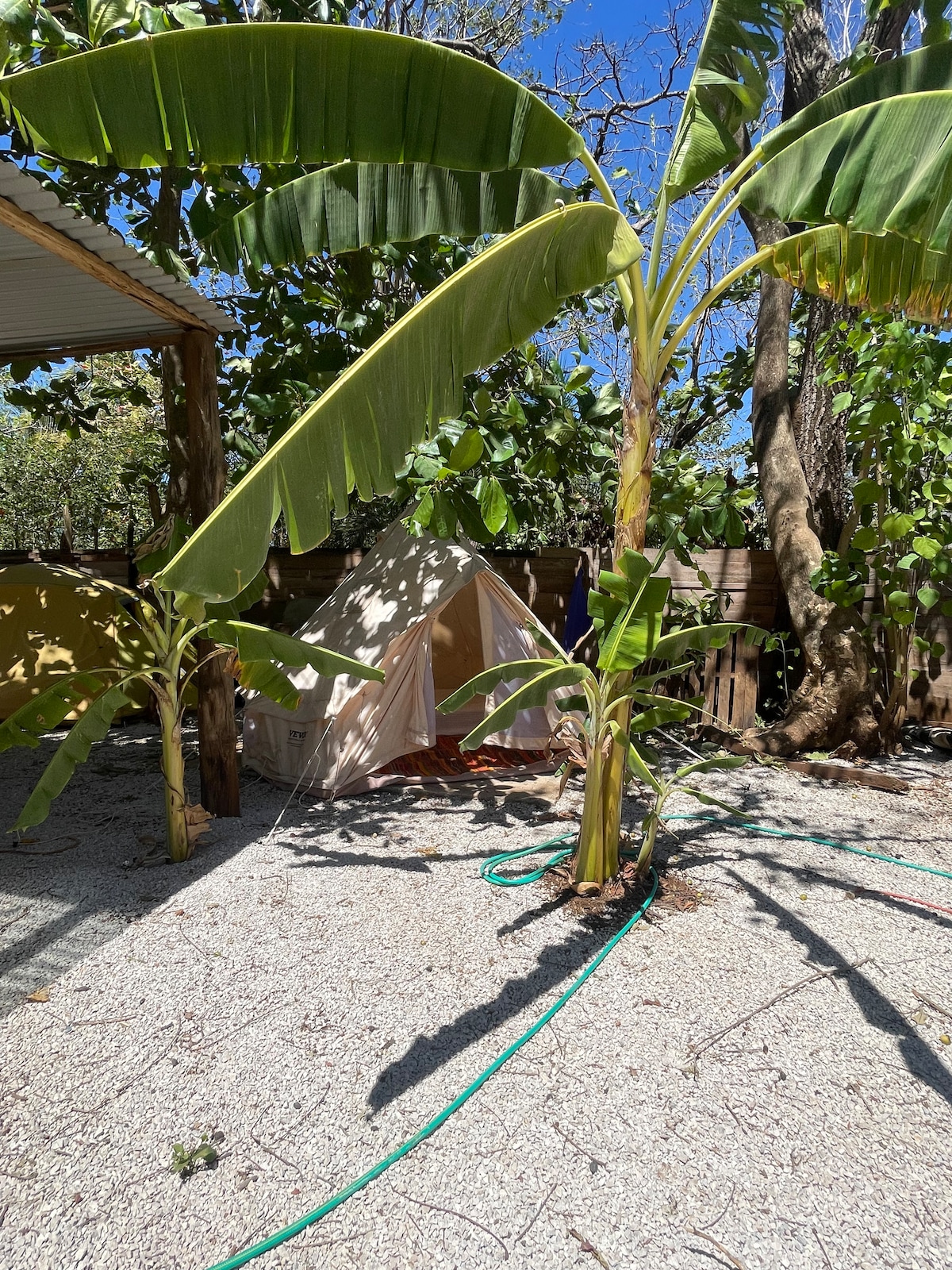 Come visit us and stay in our bell tent by the beach. Fall asleep and wake to the sound of waves. We have a community outdoor kitchen, beautiful garden, indoor and outdoor shower, washing machine, a few steps from the beach. There is a beginners surf break directly in front and we have a few rental boards if you want to catch waves. We love animals and have some rescue dogs and a cat that live here at Rising Village. There is a tienda, organic market, and delicious restaurants all walkable.