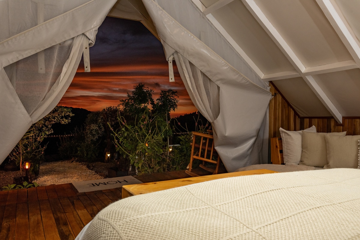 Enjoy the lovely setting of this romantic spot in nature. Escape to a one-of-a-kind luxury tent designed for two, where nature puts on a breathtaking show right in front of you. Wake up to golden sunrises over the mountains, unwind with unforgettable sunsets, and enjoy completely unobstructed views of the majestic Arenal volcano.