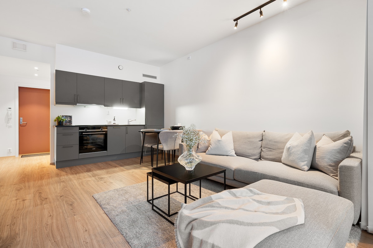 Leiligheten ligger i tredje etasje. Perfekt plassert med ca. 5 minutter gange til både Trondheim Torg, Øya/Nidelven, og til sjøen. Innvendig er den unikt utformet med buet vegg og ovalt vindu i stuen. 66 kvm, romslig med høyt under tak og 17 kvm soverom. God størrelse på bad. Innredet med en blanding av klassisk retro møbler og moderne møbler. Stuen har fin utsikt mot Steinåsen. Utmerket tilgang til kollektivtransport, med kort busstur til eksempelvis Bymarka eller Solsiden.
