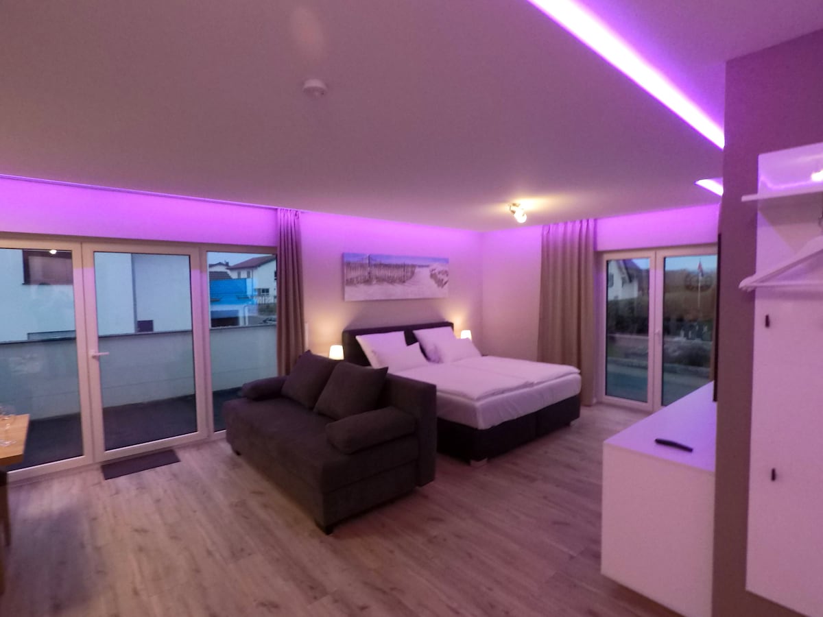 Traumhaftes Balkon-Apartment in einer hervorragender Randstadtlage in Fulda. Bei der komplett neuen Ausstattung wurde Wert auf höchste Qualität gelegt: Hochwertigste LED-Beleuchtung, sämtliche Fenster-Rollläden elektrisch, in jedem Raum Fußbodenheizung. Eine Top Moderne Küche. LED-Flach-Fernseher (Smart-TV, 65-Zoll) Großes Boxspringbett mit First-Class Matratzen inkl. Topper und ein Schlaf-Sofa.