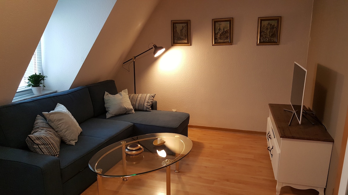 Wir vermieten eine kleine Wohnung auf der ersten Etage, welche komplett möbliert ist. Es ist ein 3-Familien-Haus, indem wir mit unseren zwei Hunden und einem Kater wohnen. Unsere Haustiere sind freundlich zu allen Menschen. Die Lage ist ruhig und es sind ca. 3km bis zur Stadtmitte. Ganz in der Nähe (450m) ist ein Einkaufszentrum (Netto, Hausarzt, Apotheke, Post, Bäcker und Friseur ...) Busverbindung in die Stadt: Linie 5/15. Wir Bieten die Gäste Haustiere nicht allein lassen.