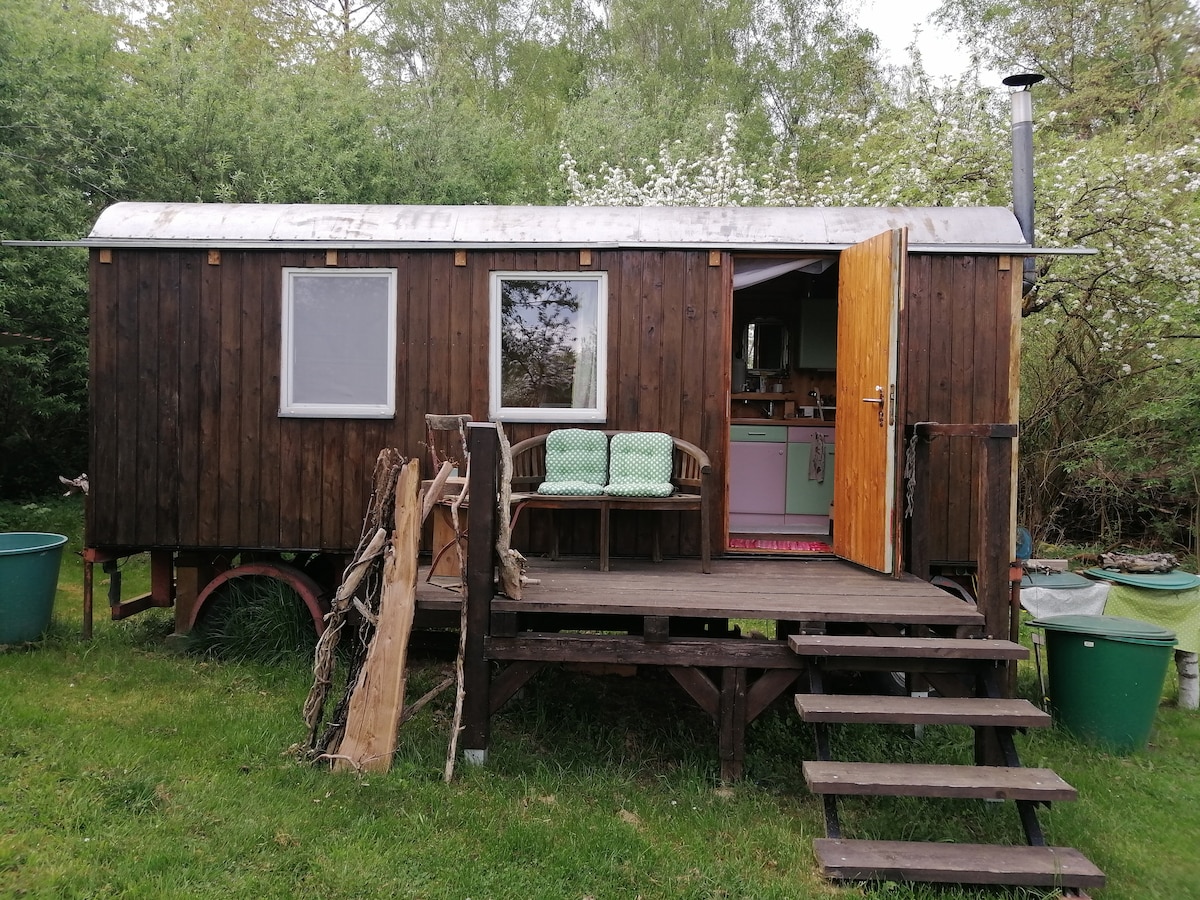 Zum Abtauchen in die Entschleunigung. Ein schlichter und einfacher Raum. Anstatt fließendes Wasser ein 10-Liter-Kanister mit Trinkwasser. Regenwasser aus der grünen Tonne für die "Katzenwäsche" unter freiem Himmel und eine liebevoll gebaute Trocken-Komposttoilette in einem ehemaligen Hühnerhaus. Vogelgezwitscher und Insektensummen. Der Wagen hat eine kleine Küche, einen "Schreib"Tisch und ein bequemes, breites Bett. Alles ist schlicht und einfach gehalten. Es gibt Strom und ein LanKabel.