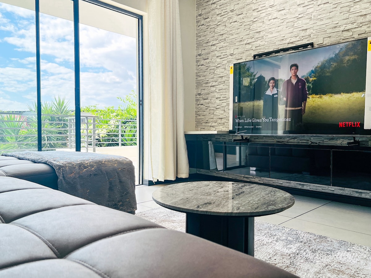 Welcome to your chic urban retreat in the heart of Fourways. Whether you're a couple seeking a romantic getaway, a solo traveler exploring the city, or a medical professional or patient needing convenient access to Life Fourways Hospital, this stylish apartment is your perfect home base. The open-plan living area is tastefully furnished with cozy seating, a flat-screen TV for entertainment, and a dining table. The space is flooded with natural light, creating a warm and inviting ambiance.
