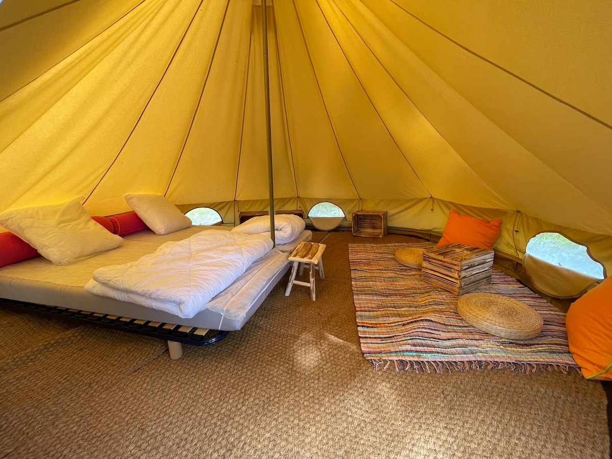 Camperen met comfort kan in onze sfeervolle bell tent van 5 meter doorsnede, gelegen op een charmante minicamping in de tuin van een 200 jaar oude pastorie. Wordt wakker tussen de fruitbomen en met een verfrissend zwembad binnen handbereik. Zeer centraal gelegen nabij het historische stadje Autun en met tal van wandel- en fiets mogelijkheden vanaf de camping. Een uitgebreid ontbijt kan worden verzorgd voor een meerprijs van €10 per persoon.