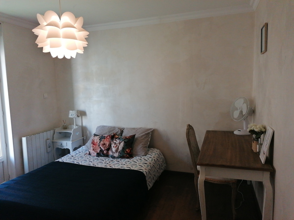 Maison de ville très calme, entièrement rénovée à 10 min à pied du centre ville, à 100 m d'une boulangerie et 200m d'une épicerie de nuit . Parking privé dans la cour. Cuisine toute équipée. Salon avec canapé convertible (couchage de 140). A l'étage 1 chambre avec lit de 140 et bureau et 1 avec lit de 90. Une SDB avec douche et wc séparés. Equipement fibre . A l'extérieur une terrasse couverte avec barbecue mis à disposition et jeu de fléchettes pour désigner qui débarrasse la table...