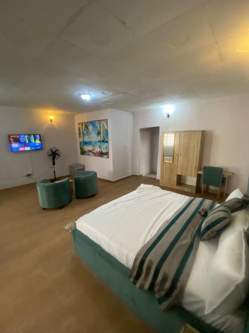 Experience comfort and serenity at our villa in Lugbe, Abuja. Featuring spacious one- and two-bedroom & ensuite bath, cozy living room, kitchenette, chef on premises to cook your hearts desires, free ironing with Laundry services, a pool with gazebo, and dedicated workstations, 24 hrs security & solar powered light, TV in every room. Designed for relaxation. Enjoy free breakfast with a minimum 2 days stay, stylish interiors with custom finishes. Discreet outdoor CCTV ensures peace of mind.